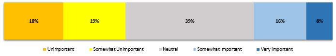 The largest response (30%) was from users who were neutral. A significant number of respondents (43%) stated that it was Somewhat Unimportant or Unimportant for team members to collaborate via chat. Only 27% of respondents indicated that it is Very Important or Somewhat Important for team members to collaborate via chat.